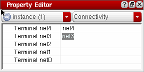 You can use the Property Editor assistant to set up the nets on the terminals of a selected instance. Select Connectivity from the property category selector list and specify the nets in the property value column for each terminal on the instance.