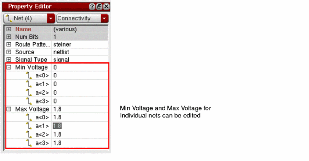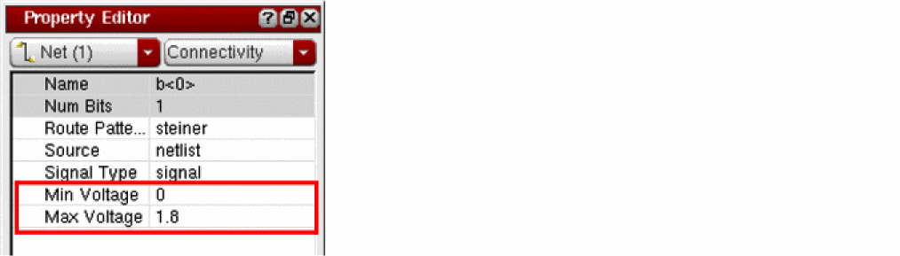In Virtuoso, the voltage range information on a net is used to verify or enforce voltage dependent constraints, such as voltage dependent spacings, minVoltageSpacing. By using the Property Editor assistant, you can view and edit the voltage range information of nets, minVoltage and maxVoltage.