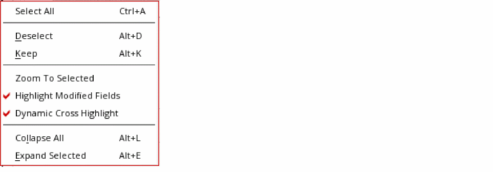 Right-click in the selection tree to display property editor shortcut menu. You have the option to select or deselect all objects in the selection tree, zoom to the selected object on the canvas, highlight the modified fields in the form, and expand or collapse nodes in the selection tree.