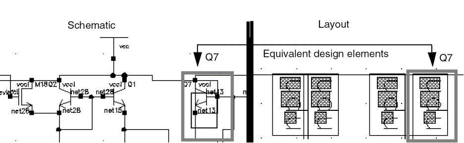 Layout XL uses the hilite drawing through hilite drawing9 entry layers for probes, which identify equivalent design elements on the schematic and the layout.