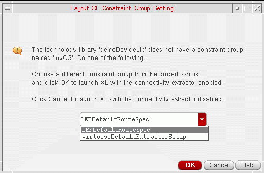 You can specify the default constraint group using the layout environment variable setupConstraintGroup. If the specified constraint group does not contain the information required by Layout XL, during initialization the software displays the Layout XL Constraint Group Setting form prompting you to do one of the following: