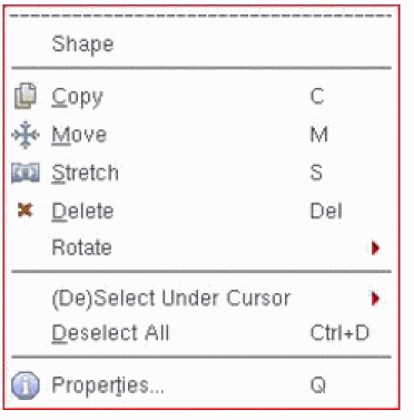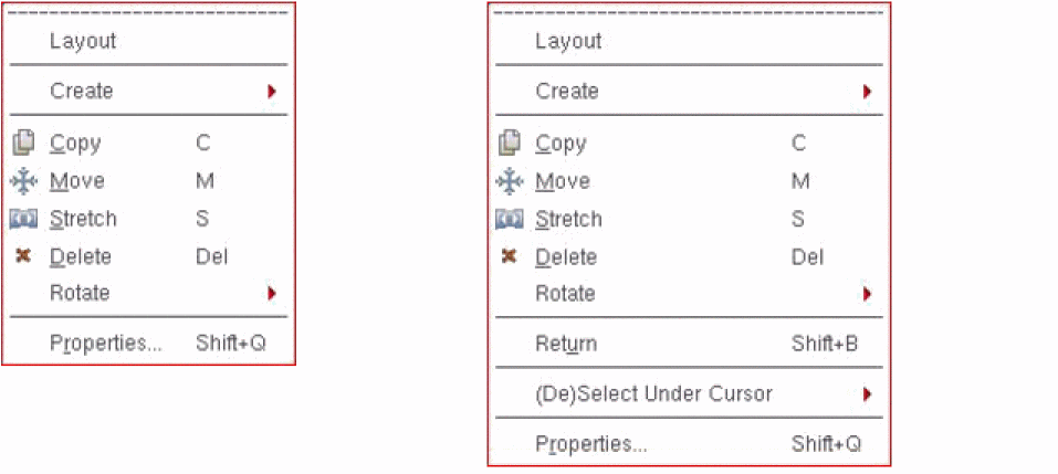 Shortcut menus display context-sensitive options, based on the object under the mouse pointer at the time of the right-click operation. Shortcut menus provide a quick access to object-specific commands. For example, the layout editor shortcut menu lets you start a few commonly used layout commands. Right-click any free space in the design canvas to display the Layout shortcut menu and select the required command.