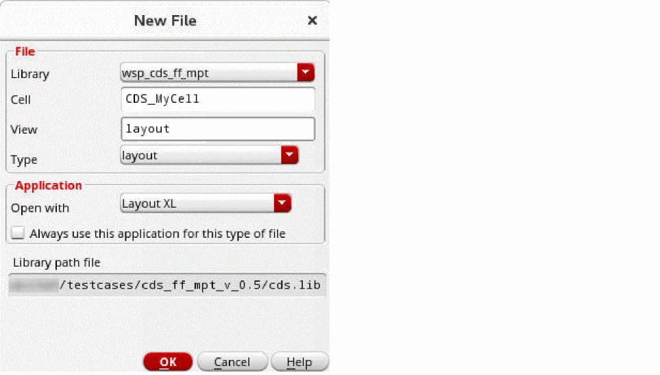 The Library path file field displays the location where the new cellview will be stored. - If the Open in option is displayed, choose to open the cellview in a new tab in the current session window, the current tab in the current session window, or a new window in a new session.