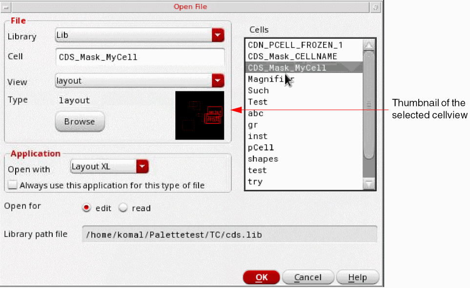 If a thumbnail of the selected cellview is available, it is displayed in the form as an aid to selection. If no thumbnail is available, the space appears blank. For more information about the thumbnail of a cellview, see - From the Open with list, choose the application that the cellview should open with.