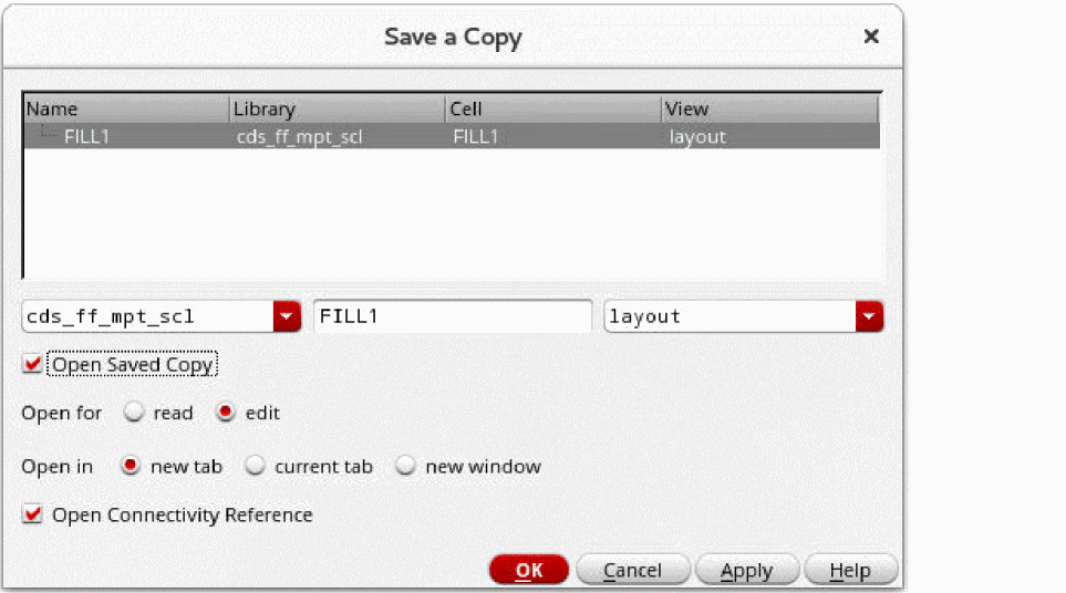 The fields at the bottom of the form are populated based on the selection in the table. If multiple rows are selected, then the field displays the value if all the values in the selected rows are same. Otherwise it shows AS IS. - Type new Library, Cell, and View names you want to use. In the example above, the library and cell names are unchanged, but the view name for all the cells has been changed from layout to layout.edited.