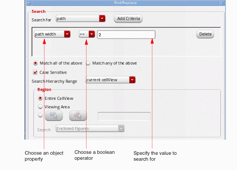 - Select the location where you want to perform the search by choosing from the Search Hierarchy Range list. By default, the search is performed in the current edit cellview in the layout window.