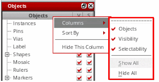 Use the Objects panel to manage the visibility and selectability of objects such as instances, pins, and vias in a design.