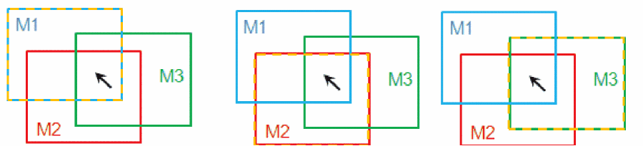 When the pointer is on overlapping objects in the design window, press the spacebar to cycle through the preselected objects. In the following example, the pointer is in the area where the three objects M1, M2, and M3 overlap. You can cycle through the preselected objects (dynamic highlight) using the spacebar.