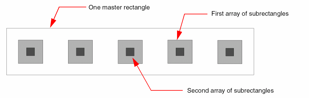 A multipart rectangle is a single object composed of multiple parts on the same or different layers. The parts consist of one or more named master rectangles and one or more arrays of unnamed subrectangles. Each named master rectangle is a separate object with ROD attributes, created at level zero in the hierarchy. Each unnamed sub-rectangle is an ordinary, unnamed database shape with no ROD attributes, created at level zero in the hierarchy.