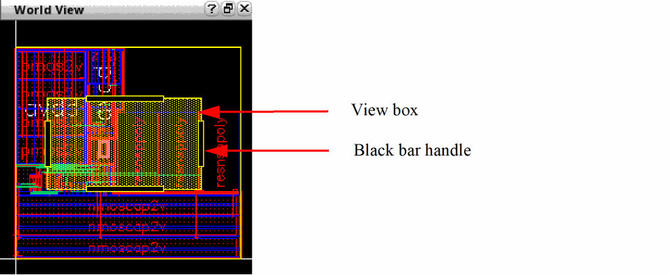 The World View assistant appears, marking the current design area displayed on the canvas with a view box, represented by a yellow rectangle.