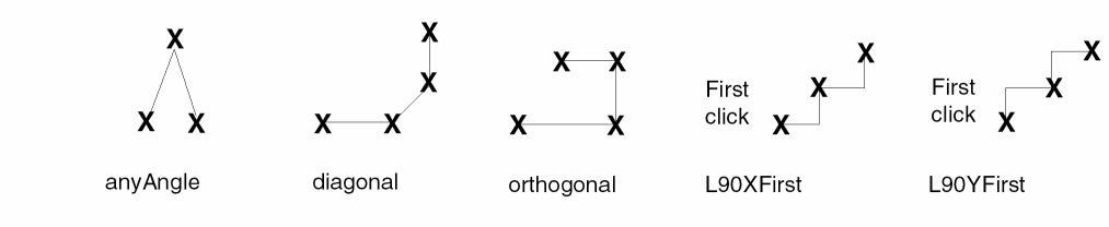 The create commands use the snap mode to control the shape of segments as you create or reshape objects. The following figure illustrates the snap mode settings.