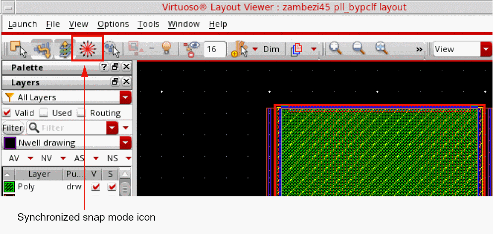 When both the create and edit snap modes are synchronized, the appropriate icon (anyAngle, diagonal, or orthogonal) displays as the synchronized Create/Edit Snap Mode icon, as shown in the figure below.