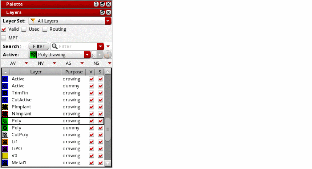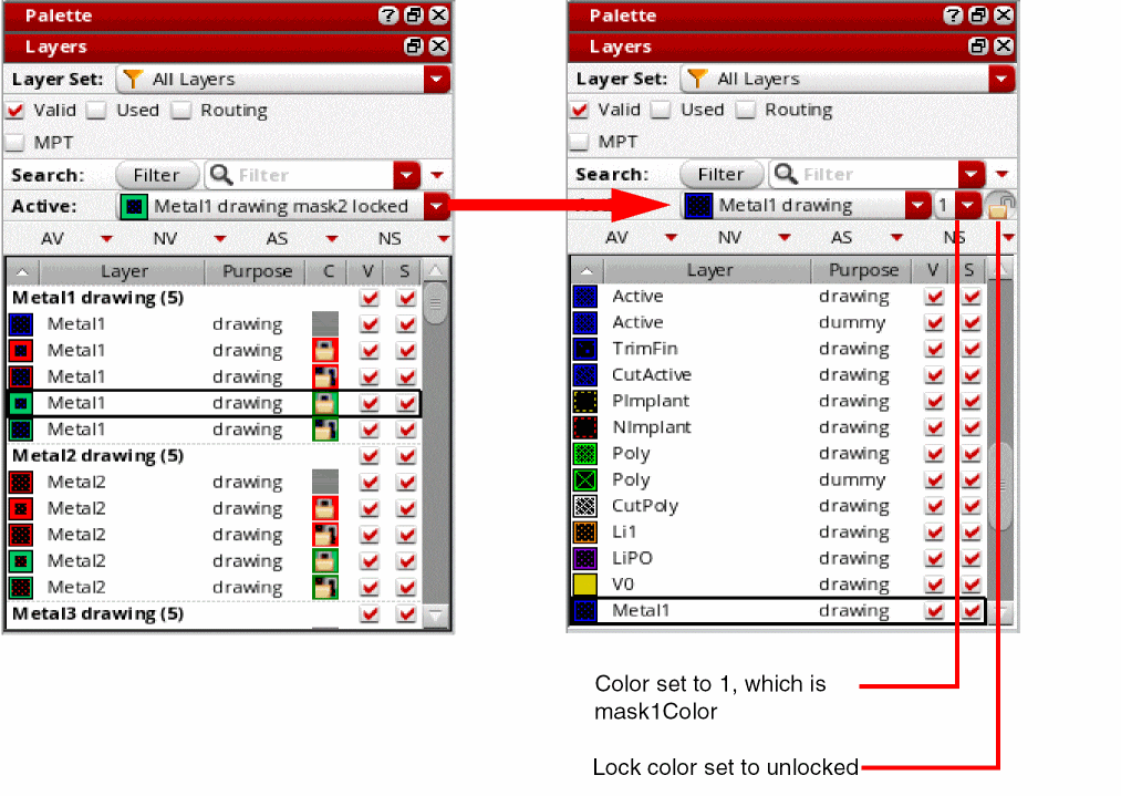 The compact MPT mode hides the C (Color) column in the Layers panel and displays the Color and Lock color options on the Active Layer toolbar. You can use these options to select the color and lock state combination for a layer-purpose pair with color. When you enable compact mode, Color is set to 1, which is mask1Color, and Lock color is set to the unlocked state for an active layer-purpose pair with color, as shown in the figure.
