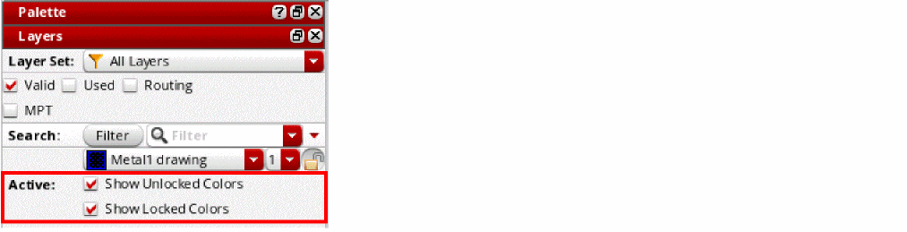 In compact mode, to control the visibility of colored shapes based on their lock status, you can use the Show Unlocked Colors and Show Locked Colors options on the Active Layer toolbar. These options are displayed when the pteShowColorControlsForMPT environment variable is enabled.
