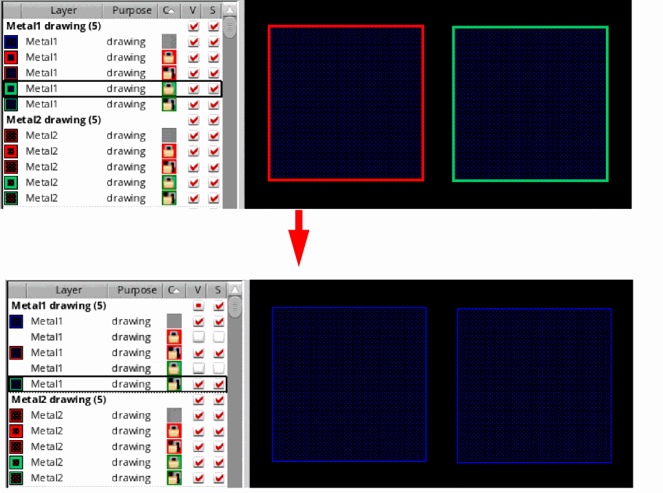 To control the visibility and selectability of shapes drawn on a layer, use the V (Visibility) and S (Selectability) check boxes corresponding to the layer-purpose pair in the Layers panel. Shapes drawn on a layer become invisible if you deselect the V (Visibility) check box corresponding to that layer.