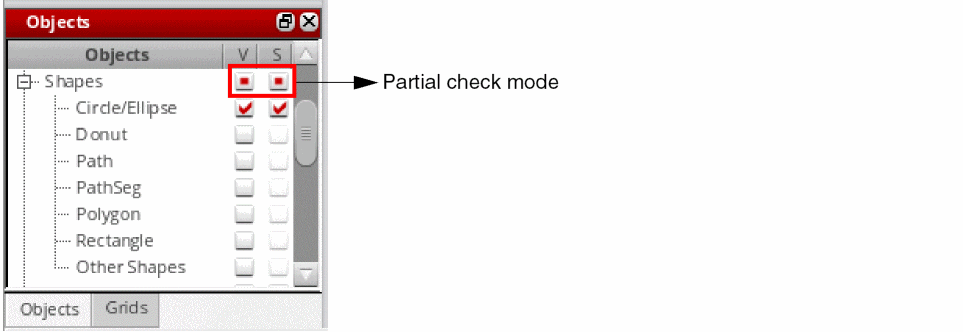 Synchronized mode: This is the default mode where the parent and child items are in a synchronized state. When you reset the visibility and selectability of a parent, by selecting the corresponding check box in the panel, the visibility and selectability setting of the child items is set to coincide with that of the parent. If you now reset the visibility or selectability of a child, the parent is set to a partial check mode to indicate that one or more child items override the visibility or selectability settings of the parent, as shown in the following figure.