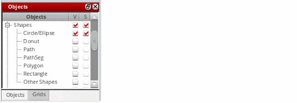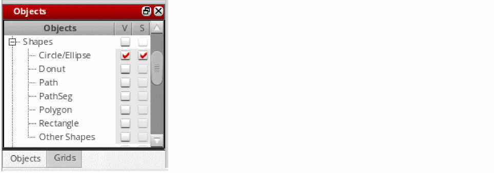 If you now turn off the visibility of the parent by deselecting the corresponding V (Visibility) check box, the visibility and selectability states of the child objects are not affected. As a result, the V (Visibility) check box for the Circle/Ellipse child object stays selected, as shown in the following figure, but the child object would no longer be visible on the canvas.