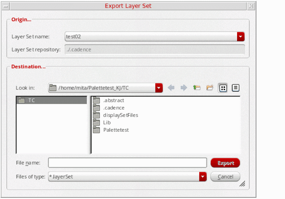 The Export Layer Set form appears. The Layer Set repository field in the Origin section displays the repository in which the layer set is stored. This is a non-editable field.