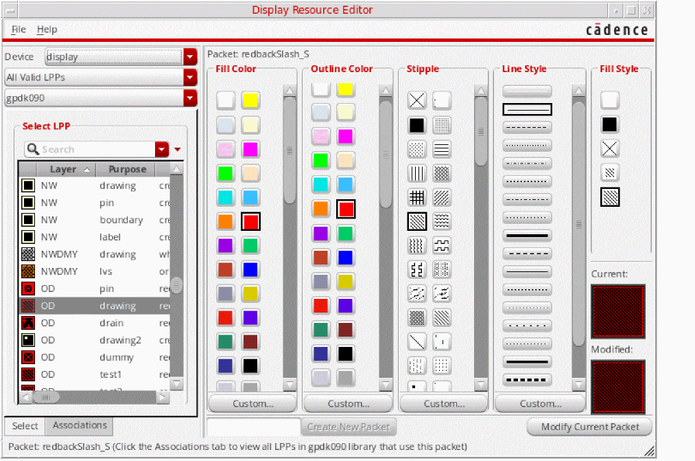 The appearance of layer-purpose pairs in the layout window and in Palette panels is defined in the technology file and the display.drf file. The display.drf file defines display resources, including colors, stipples, line styles, and packets. Each packet is a named combination of fill color and style, outline color, stipple, and line style. Packets are associated with one or more layer-purpose pairs in the technology file.