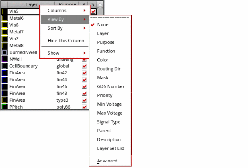 In the Layers panel, you can displays layer-purpose pairs in a tree structure by grouping them based on a single or multiple columns. For example, you can choose to display layers-purpose pairs based on the Layer column. This groups the layers with the same name, but different purposes. This helps you to quickly control the visibility and selectability of a layer and all the purposes associated with that layer. For example, if Metal1 layer has different purposes such as drawing, slot, and label, you can control the visibility and selectability of all Metal1 layer-purpose pairs together by selecting or deselecting the V (Visibility) and S (Selectability) check boxes corresponding to the Metal1 layer. You can also modify the visibility and selectability of individual layer-purpose pairs, if required.