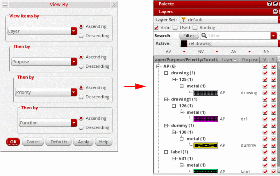- Choose Ascending or Descending to specify the display order of layer-purpose pairs.