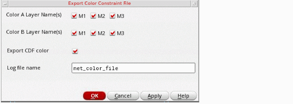 Select the Color A Layer Name(s), Color B Layer Name(s), and Export CDF color options on the Export Color Constraint File form. Also, type the Log file name.You can specify the values in the Color A Layer Name(s), Color B Layer Name(s), and Log file name fields using the environment variables, colorConstFileColorAName