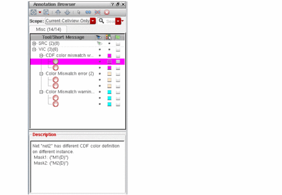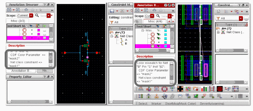 To verify net mask color assignment using Virtuoso, use the Net Color Constraint Check and CDF Color Check options available in the Verify menu of VLS XL.
