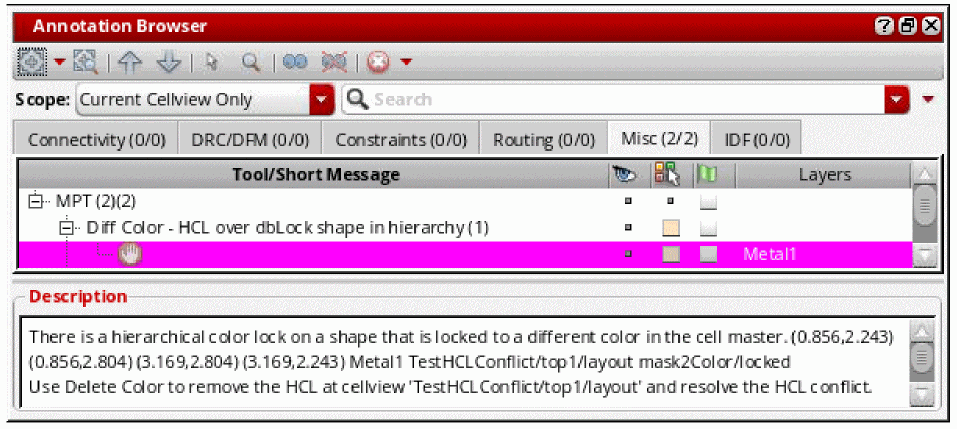 While a shape can have only one dbLock, it could potentially have multiple HCLs applied from various levels of the hierarchy. A color conflict exists when there are multiple locked color assignments for a shape.