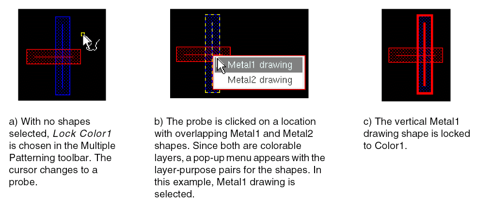 If visible and active shapes on more than one colorable layer exist under the probe, a pop-up menu appears. Choose the layer-purpose pair for the shape that you want locked or unlocked. The figure below shows an example of post-select locking in the layout.