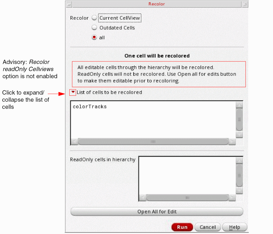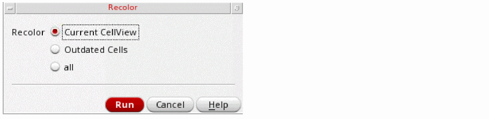 By default, Recolor All will clear all colors, then color the entire design. This is useful for determining if the design is colorable. If your design contains read-only cellviews or Pcells, refer to