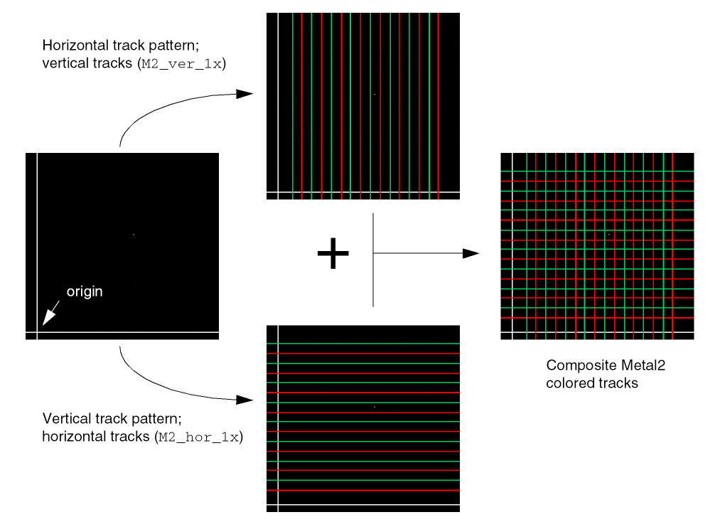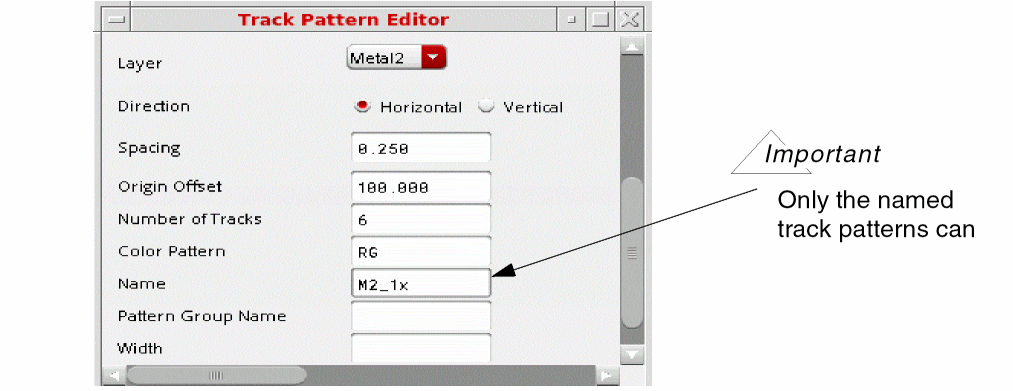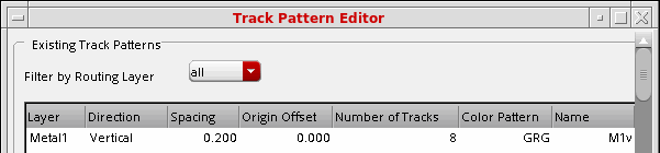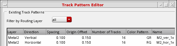 For each track pattern, you must specify the routing layer, track pattern direction, starting position with respect to the origin, spacing between tracks, and the total number of tracks. You can optionally assign a name to the track pattern, and customize the color pattern.