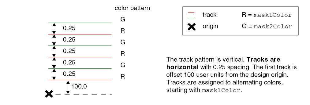 This example creates horizontal tracks on theMetal2layer, spaced 0.25 user units apart, with the first track offset 100 user units from the origin, as shown in the figure below. The first track ismask1Color, the second ismask2Color, and so on, alternating colors ("RG") until 6 tracks have been created.Example: Illustration of a Track Pattern with Alternating Colors