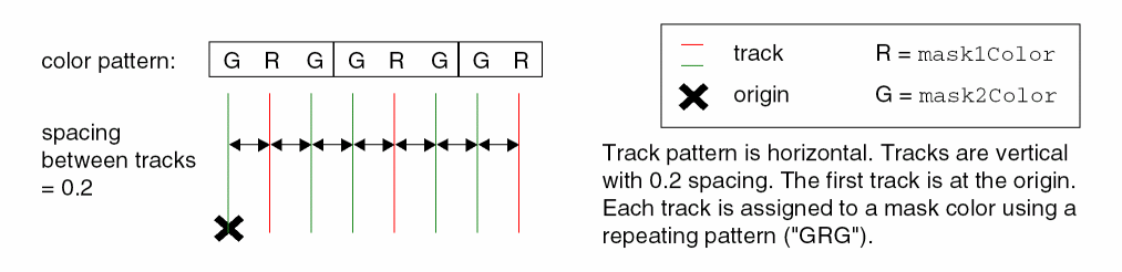 This example creates vertical tracks on theMetal1layer, spaced 0.2 user units apart, with the first track at the origin. The tracks are assigned to color masks in this sequence:mask2Color,mask1Color,mask2Color. The color track pattern is repeated until 8 tracks have been created, as shown in the figure below.