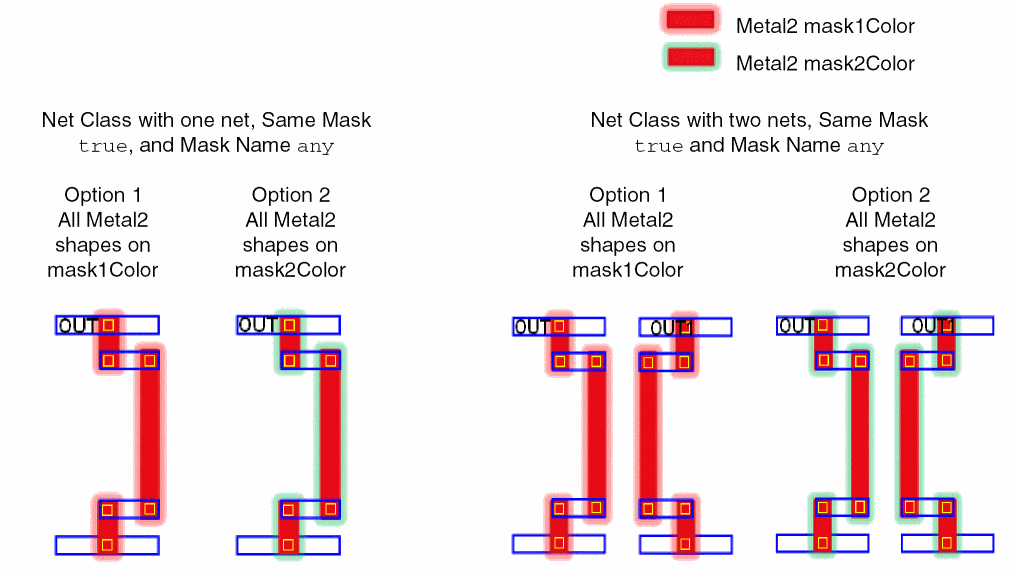 When the Same Mask pre-coloring constraint is true and the Mask Name pre-coloring constraint is any for a net class, all the shapes on the same routing layer for the nets in the net class are assigned to the same color mask. If the propagateAnySameMaskState environment variable is set to t, then all the shapes on the same routing layer for the nets in the net class are locked when one shape is locked. By default, locks are not propagated. The figure below shows examples of net classes consisting of one and two nets with Same Mask true. All shapes on Metal2 appear on the same color mask for all the nets of the net class.