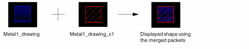When custom coloring is specified, colored shapes are displayed using the merged colored and uncolored display packets. In the following example, the uncolored packet and the mask1Color unlocked packet are shown graphically with the resultant colored shape.