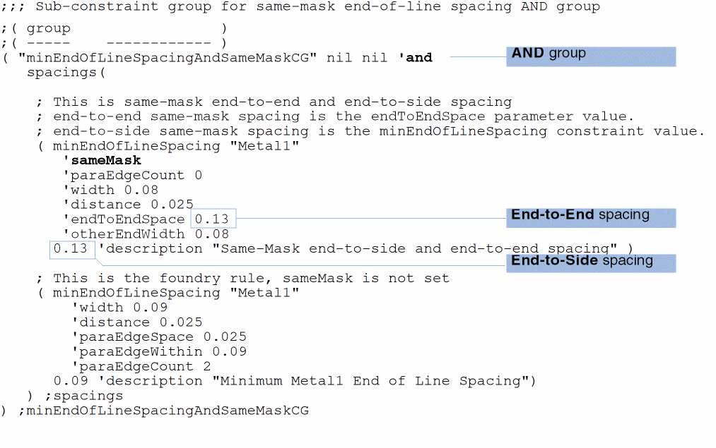 The minEndOfLineSpacingAndSameMaskCG member group sets the minEndOfLineSpacing constraint for end-to-end and end-to-side same-mask spacing ANDed with the foundry minEndOfLineSpacing rule.