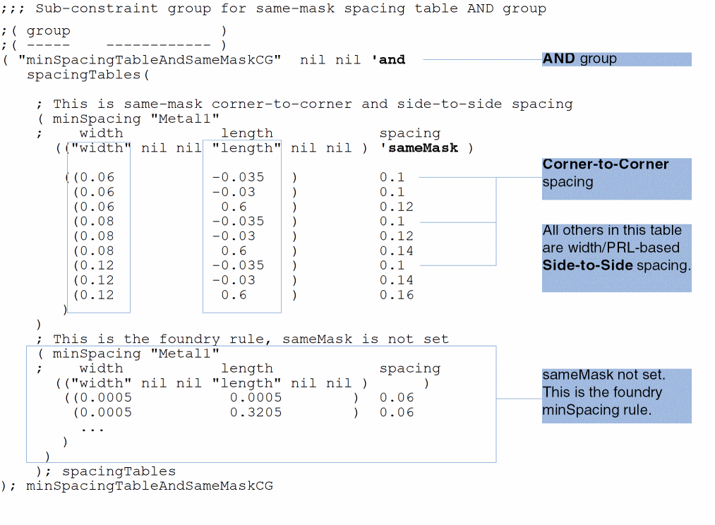 The minSpacingTableAndSameMaskCG member group sets the minSpacing constraint for side-to-side and corner-to-corner same-mask spacing ANDed with the foundry minSpacing rules.