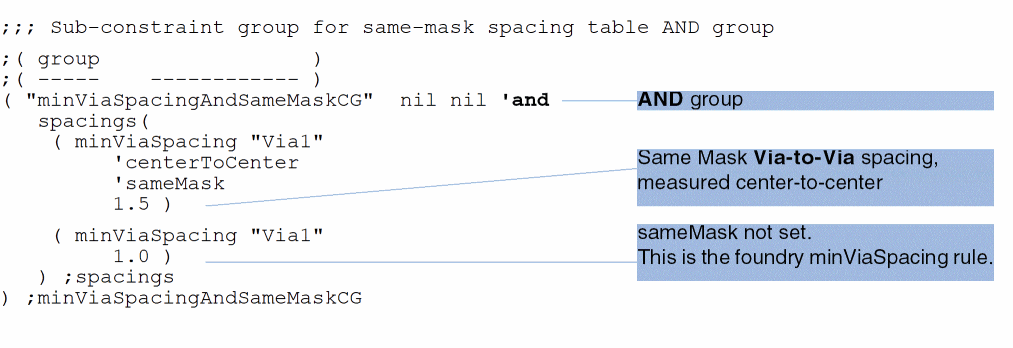minEndOfLineSpacingAndSameMaskCG,minSpacingTableAndSameMaskCG, andminViaSpacingAndSameMaskCG,are referenced in the foundry constraint group.