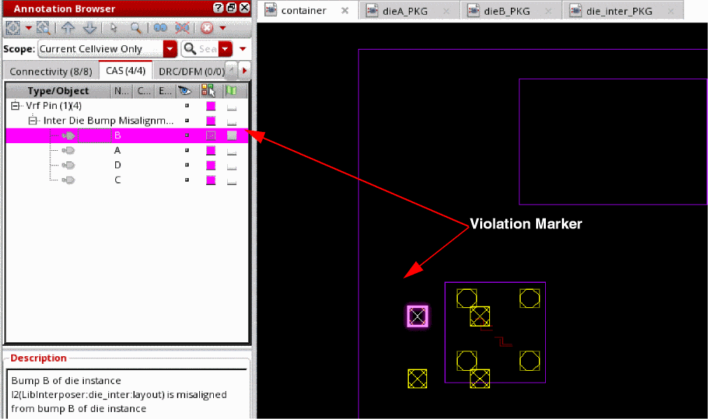 Bump alignment mismatches are flagged with violation markers on the CAS tab of the Annotation Browser assistant.