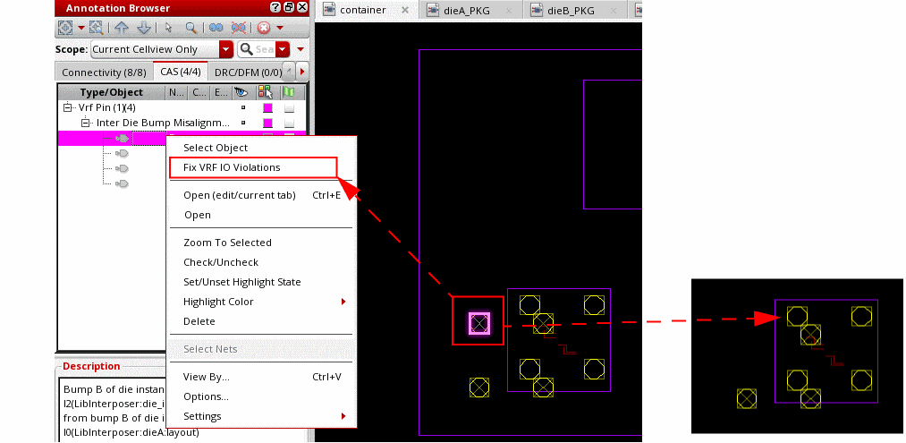 To fix a violation, right-click the violation marker and choose Fix VRF IO Violations.