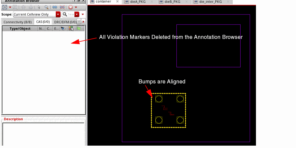 The proper alignment of bumps in the source and target instances is necessary for proper routing. Bump propagation creates bumps in the target instance that are aligned with the bumps in the source instance. However, when making manual adjustments to the design, you might accidentally move a bump. The final task in the bump management flow is to verify the alignment of bumps in dies that are stacked one over the other and fix alignment issues, if any.