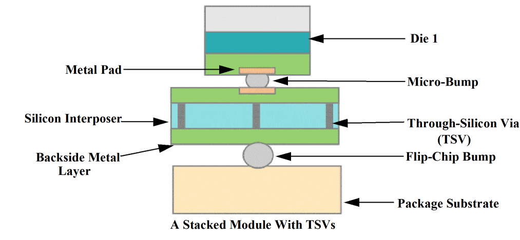 A stacked module is a circuit that is integrated vertically with two or more dies that are stacked, aligned, and bonded using bumps. In conventional ICs, dies are connected using bumps or bonding pads on one side of the chip. In stacked modules, re-distributed layers (RDLs) are generated at the back of the chip. Bumps can be placed on both sides of the chip. Through-silicon vias (TSVs), through-package vias (TPVs), bumps, and silicon interposers help establish interconnections between dies.