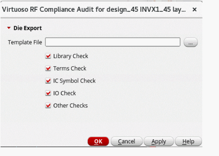 When exporting a die for the first time on an IC layout, it is not uncommon to find errors in your design. One of the reasons might be that the design has not been set up correctly for the Virtuoso RF Solution requirements. The audit functionality is a checker utility that reports all errors or warnings for an export die function on an IC layout before actually exporting a die. You can click Module – Compliance Audit to open the Virtuoso RF Compliance Audit form.During the audit, you are provided the same environment or settings as while running actual die export functionality to ensure that the same issues can be found and fixed earlier in the cycle. You can specify the template file that is exported from the Export Die form to give the desired settings for die audit.
