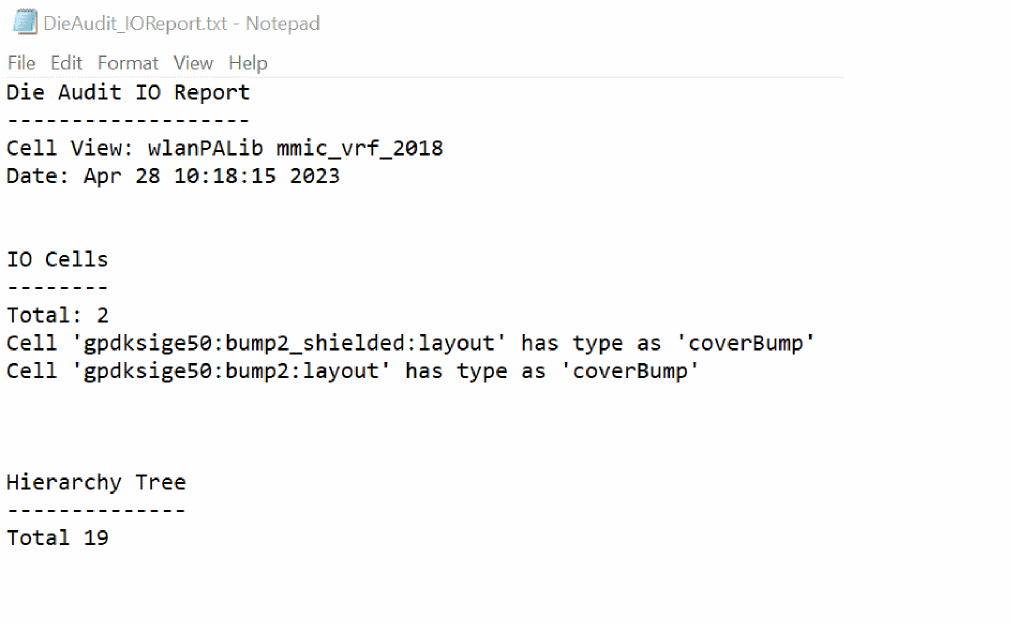 You can view the following report that is created in the working directory after the die audit has been performed. It reports all bumps cells even if Unconnected pins are set to off.