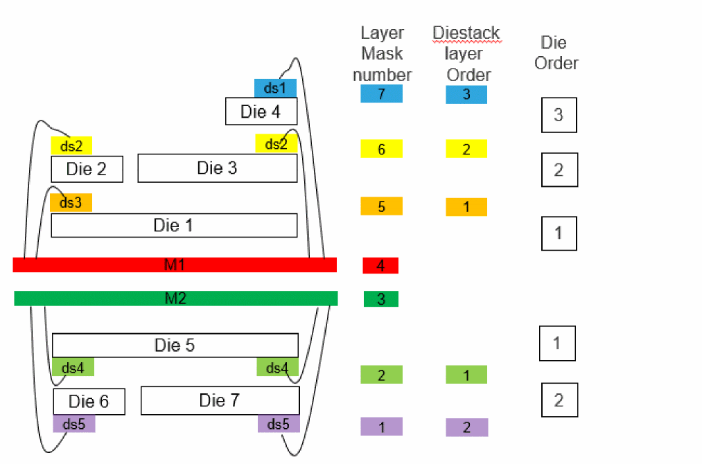 Die stack layer order- Based on the layer mask number, the diestack layer order is the position of the diestack layer from the metal layer. The diestack layer order is not saved in a techFile but automatically derived from the layer mask number.