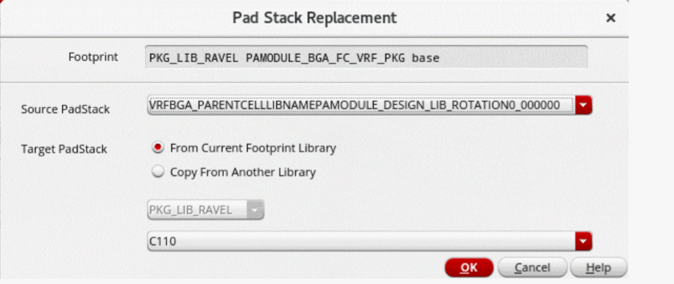 - Select from the From Current Footprint Library or Copy From Another Library check boxes to specify the target padstack cell.