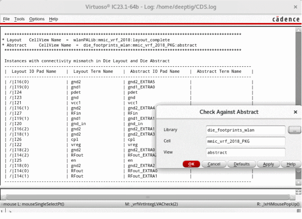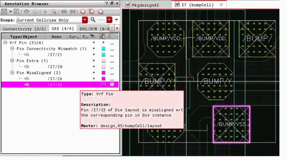 The Layout Versus Abstract (LVA) checker compares the IC layout with the die abstract and generates markers showing the differences. You can run the checker on all bumps or only the selected bumps in the IC layout.