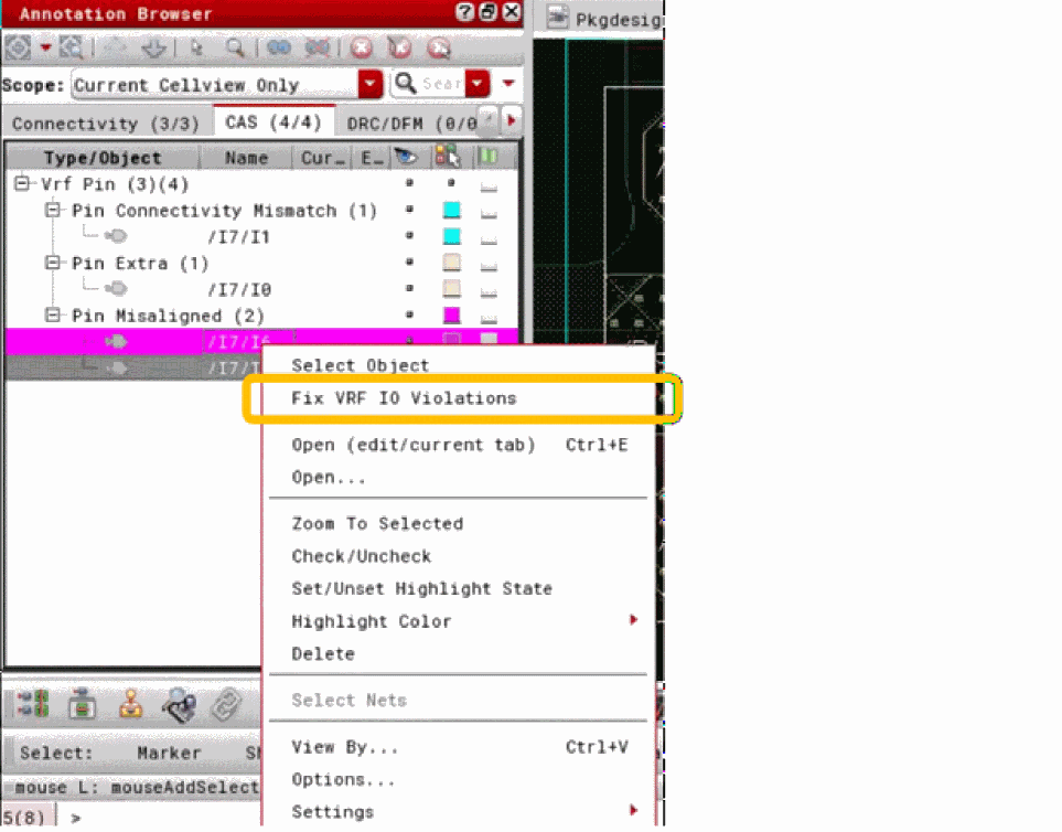 Click Module – Compare Layout With Abstract – Fix. Alternatively, click Fix Virtuoso RF IO Violations from the shortcut menu in the Annotation Browser.