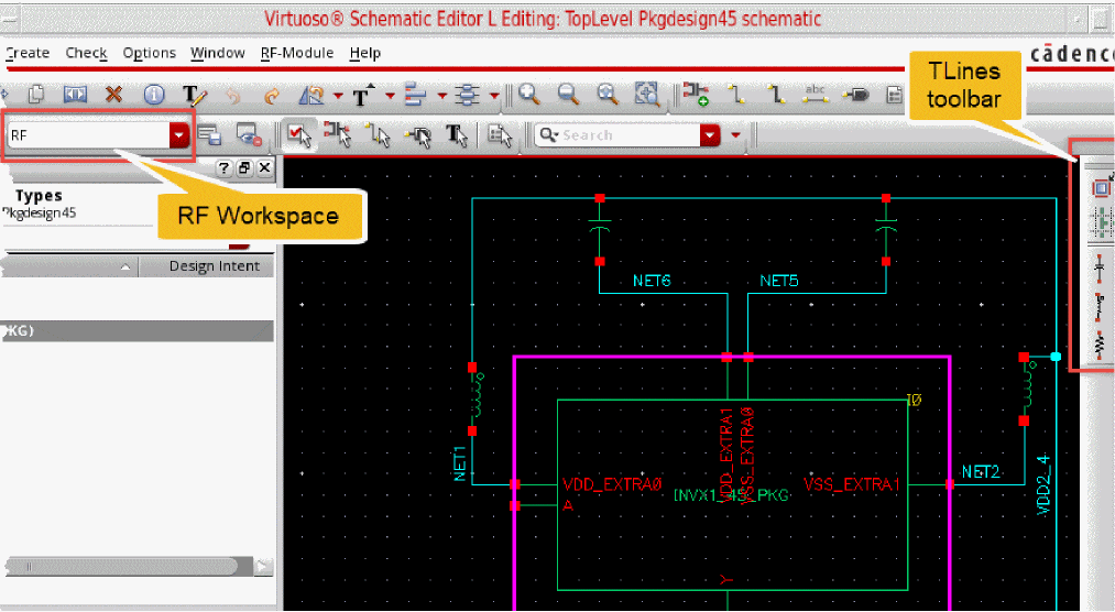 TLine instances can be added to the package schematic by using the RF toolbar available in the RF workspace. The RF toolbar lets you access the TLine components that can be placed in the schematic.