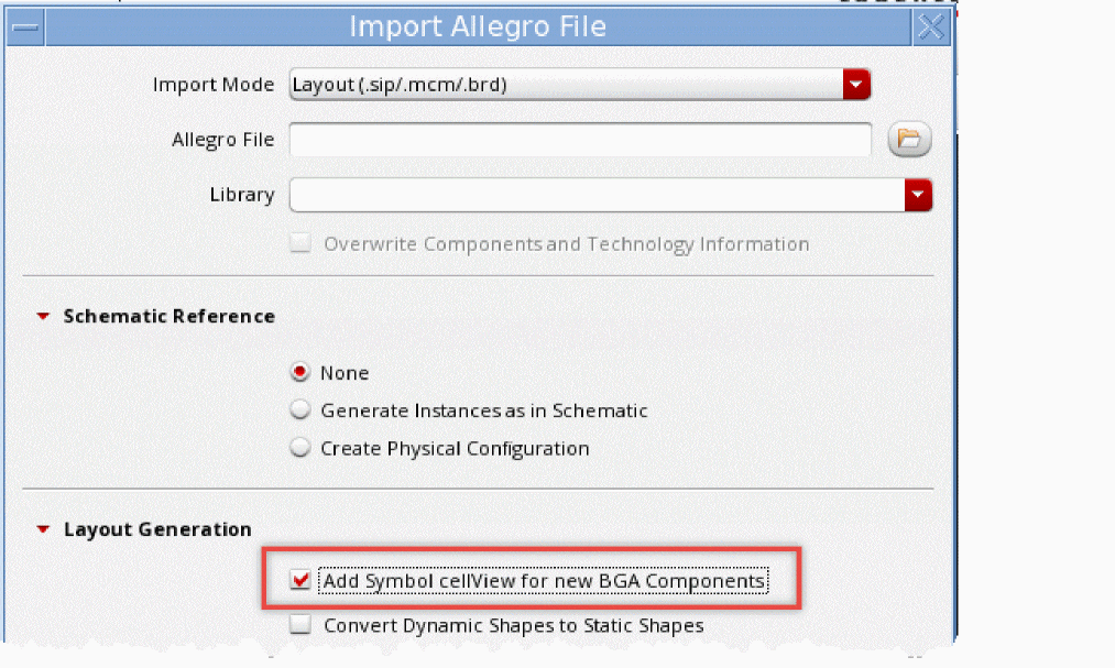 Select the Add Symbol cellView for new BGA Components in the Import Allegro File form for creating the symbol while importing from Allegro.